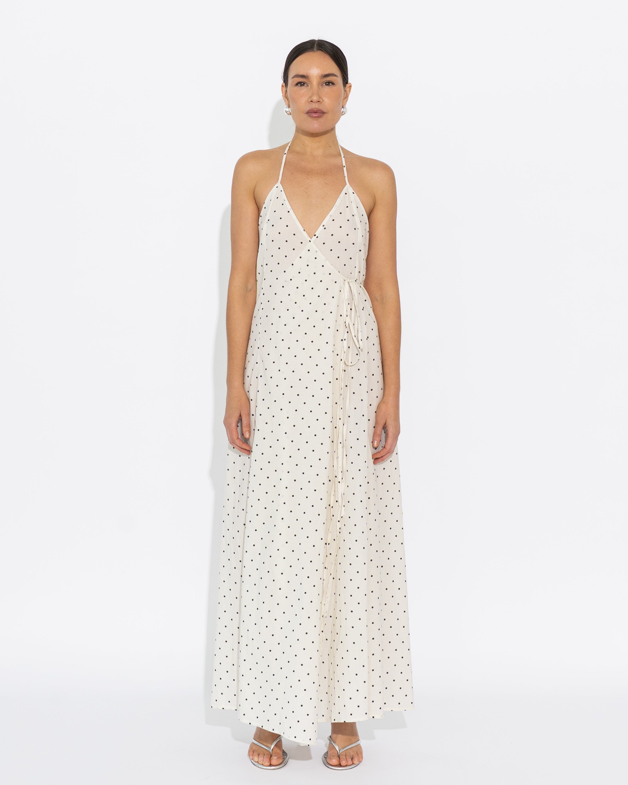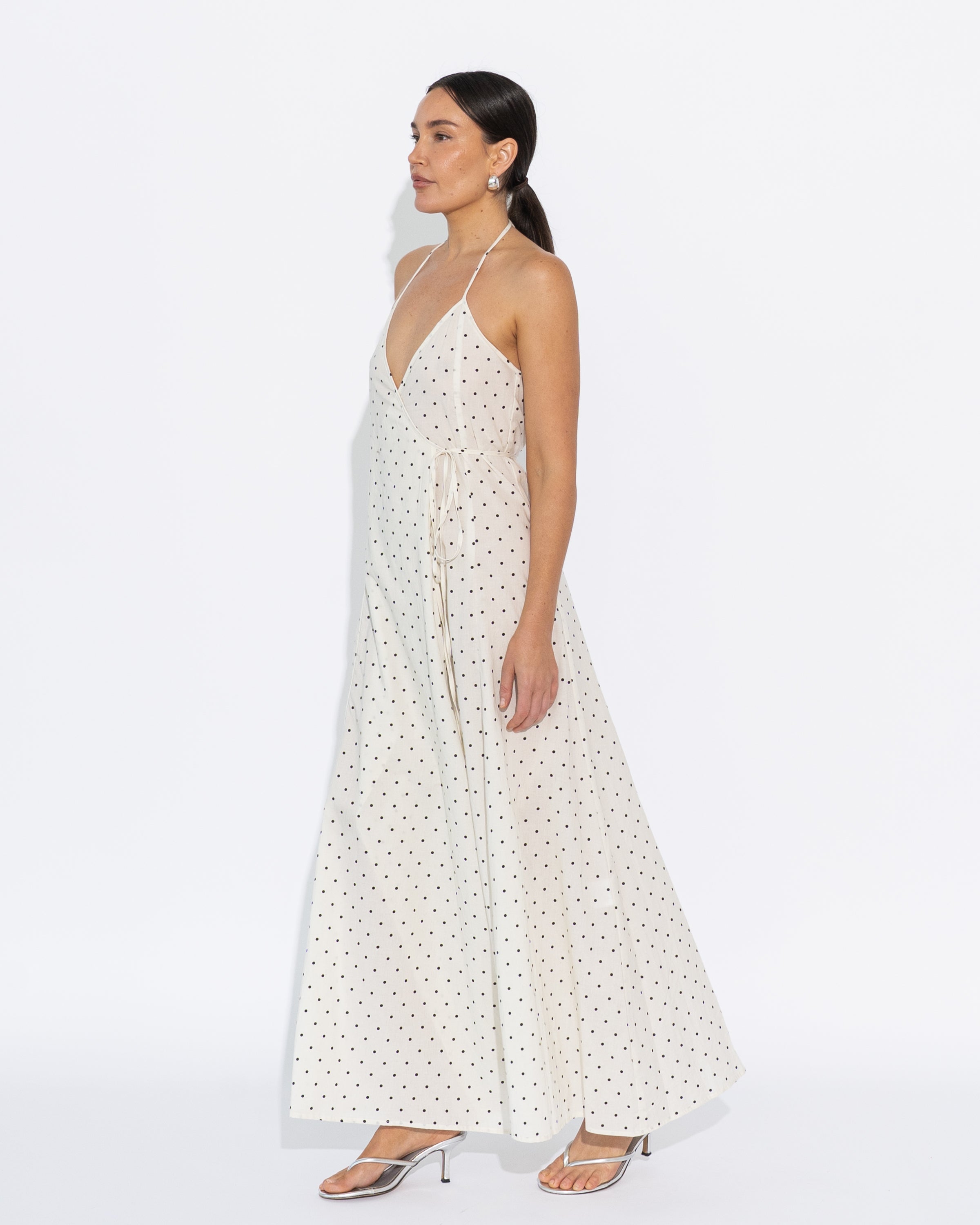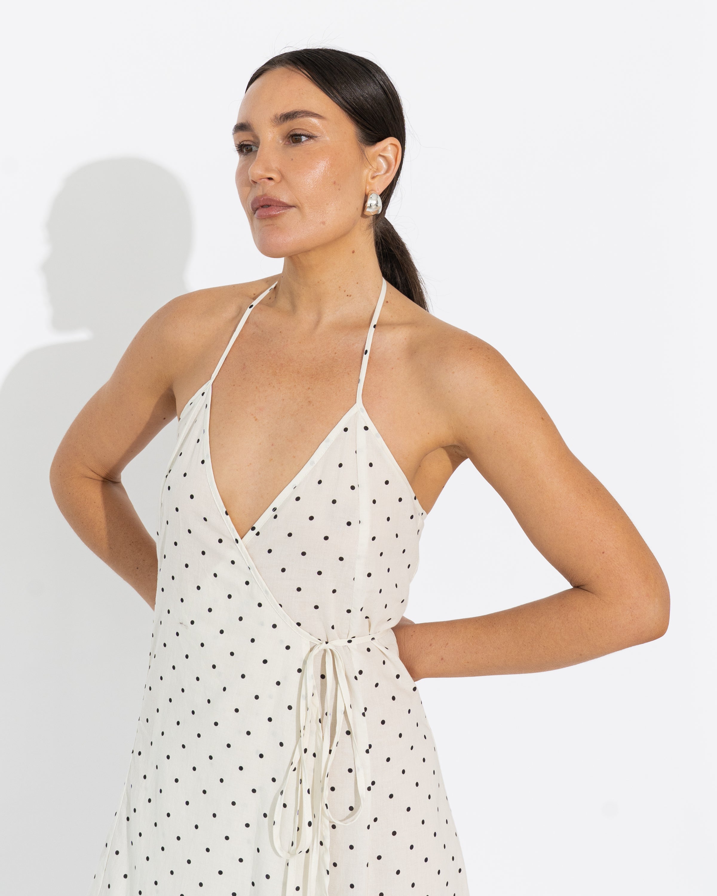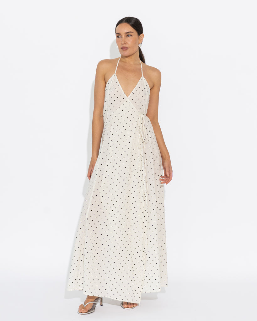Wrap style halter dress with ties. Crafted from cotton voile in our exclusive Vanilla/Black Polka Dot print.