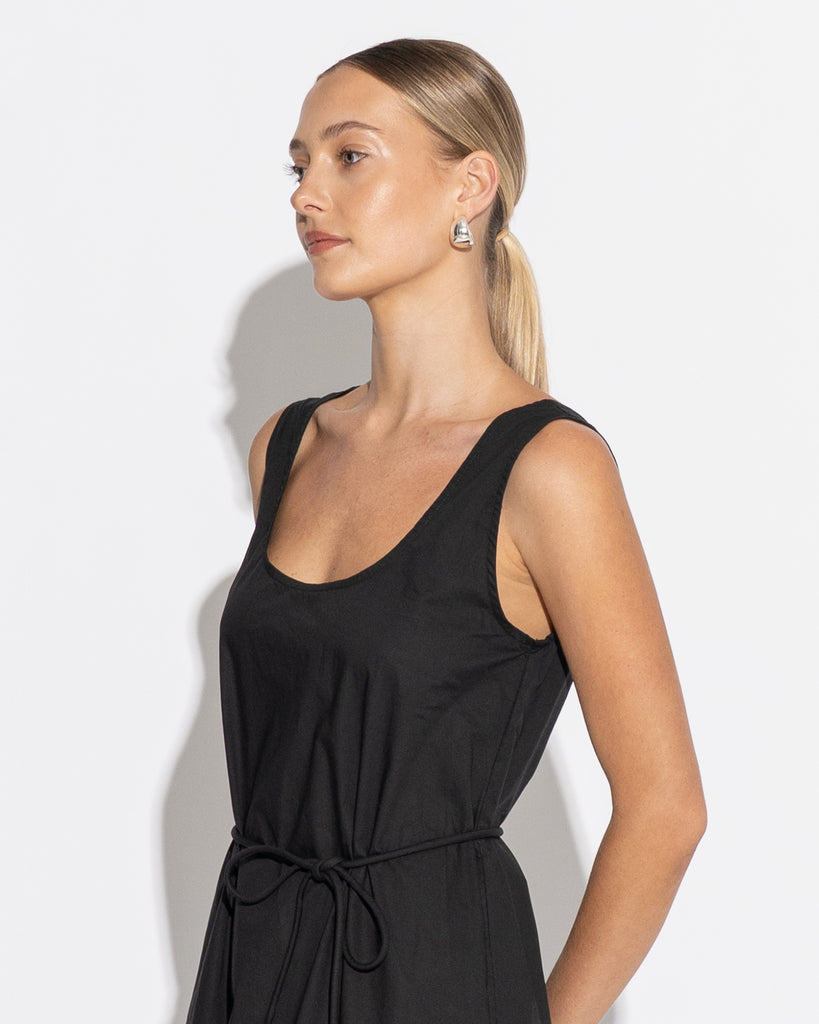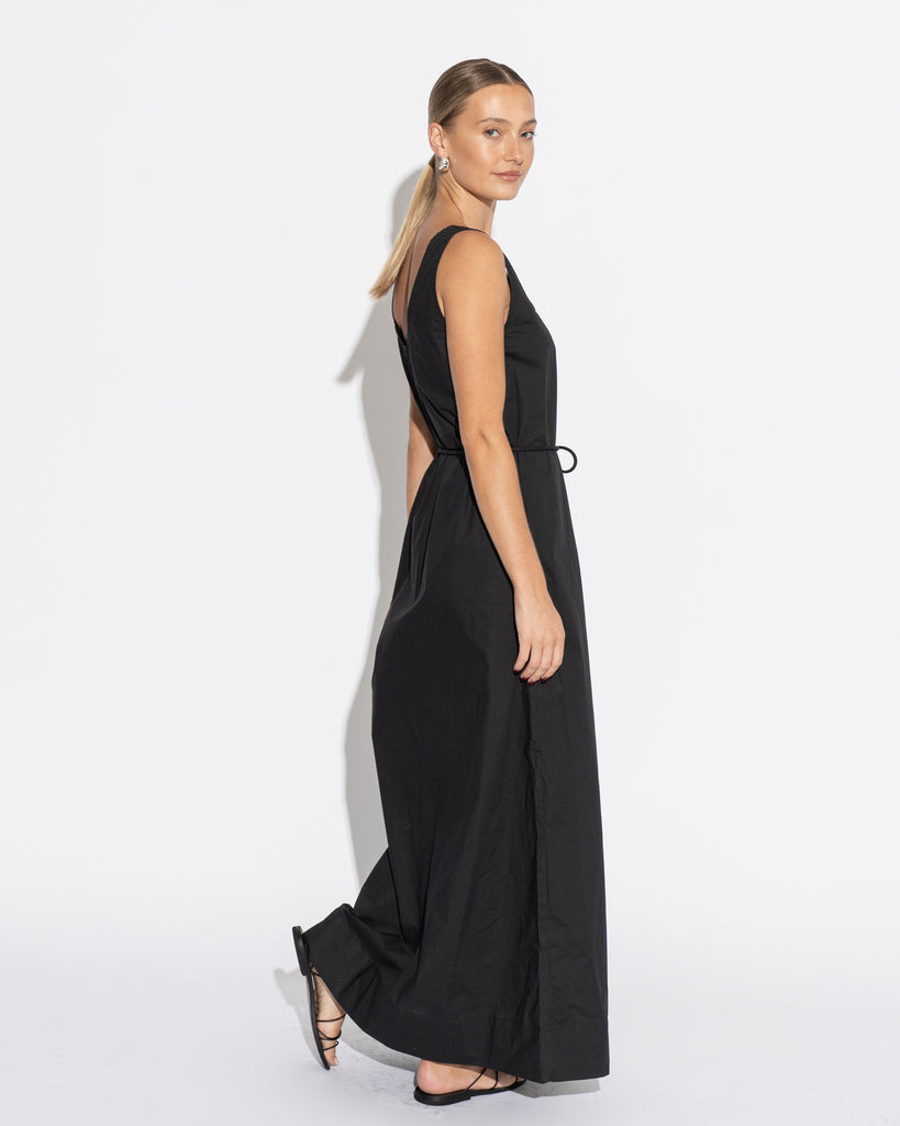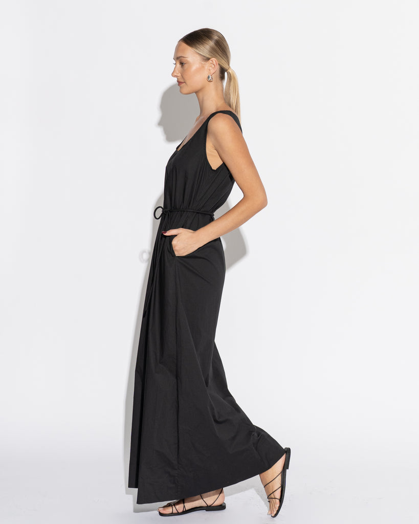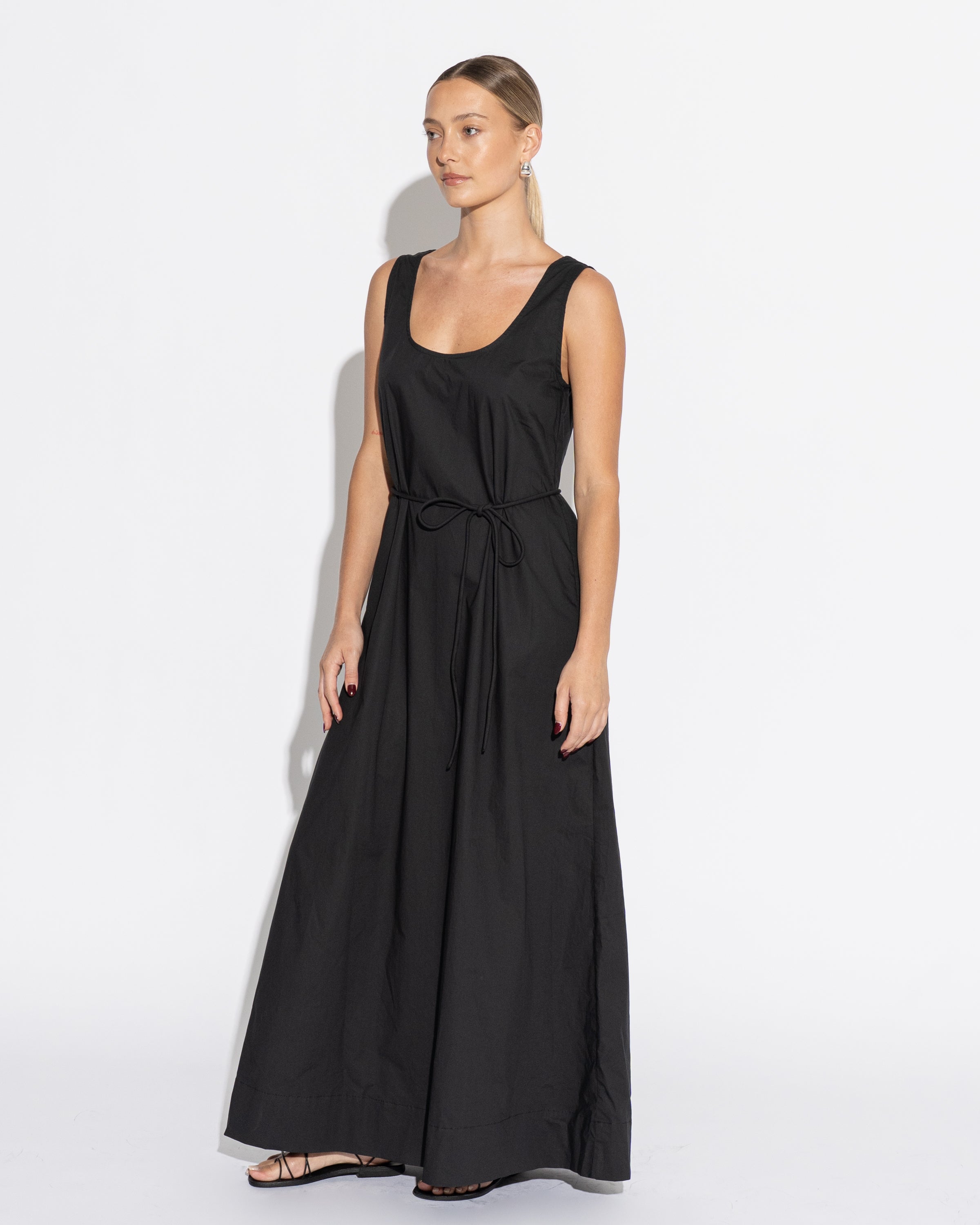 The Samba Maxi features a scoop neck and A-line skirt, side pockets and optional waist tie. The Samba Maxi is available in Black and Tangelo.
