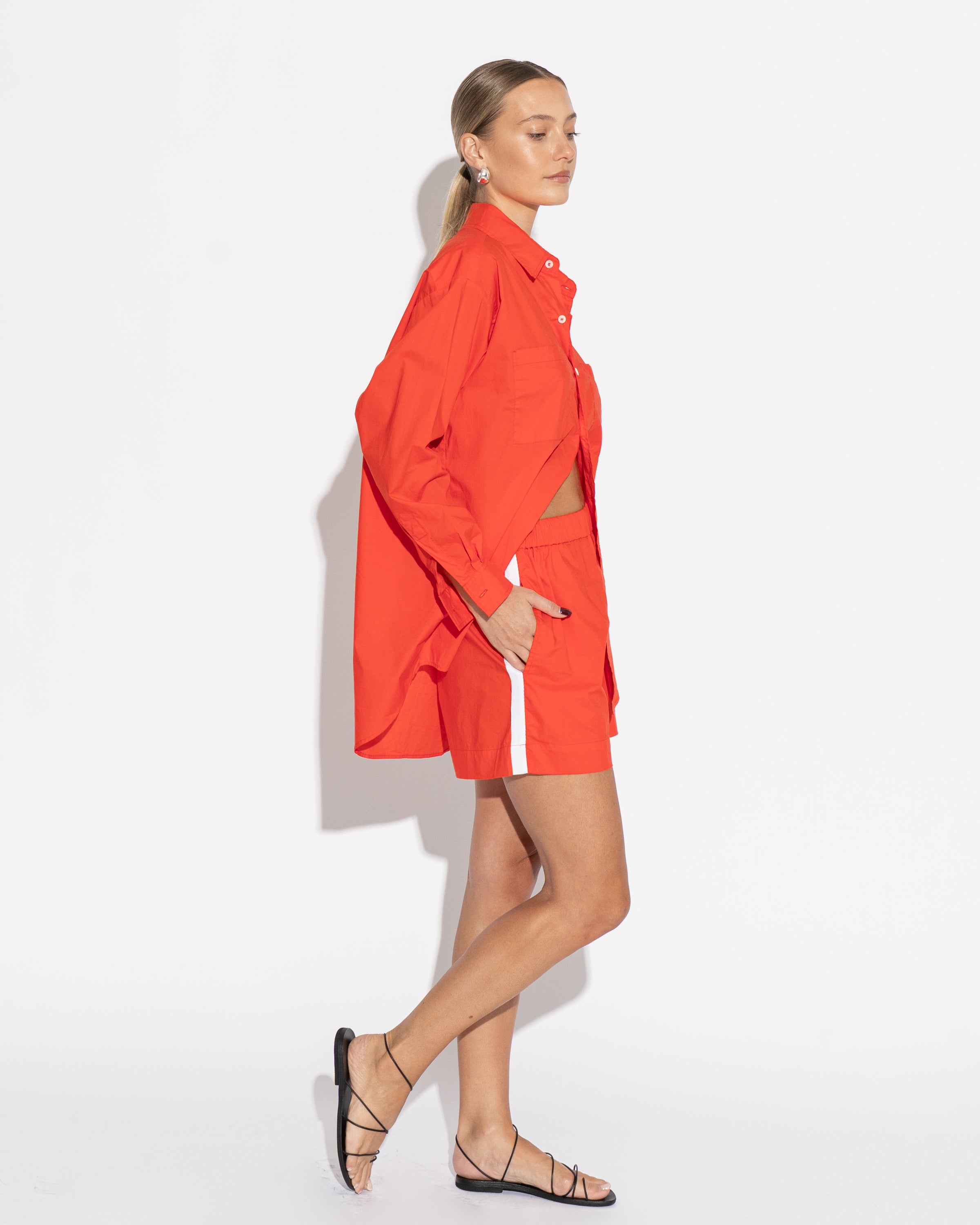 A wide leg, sporty style short featuring an elasticised waist, side pockets and a white cotton herringbone stripe down the side. Style them on waist or lower on hip. Pair with our Boyfriend Shirt to complete the look.