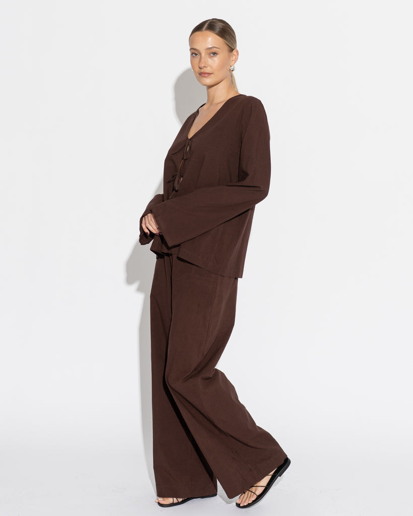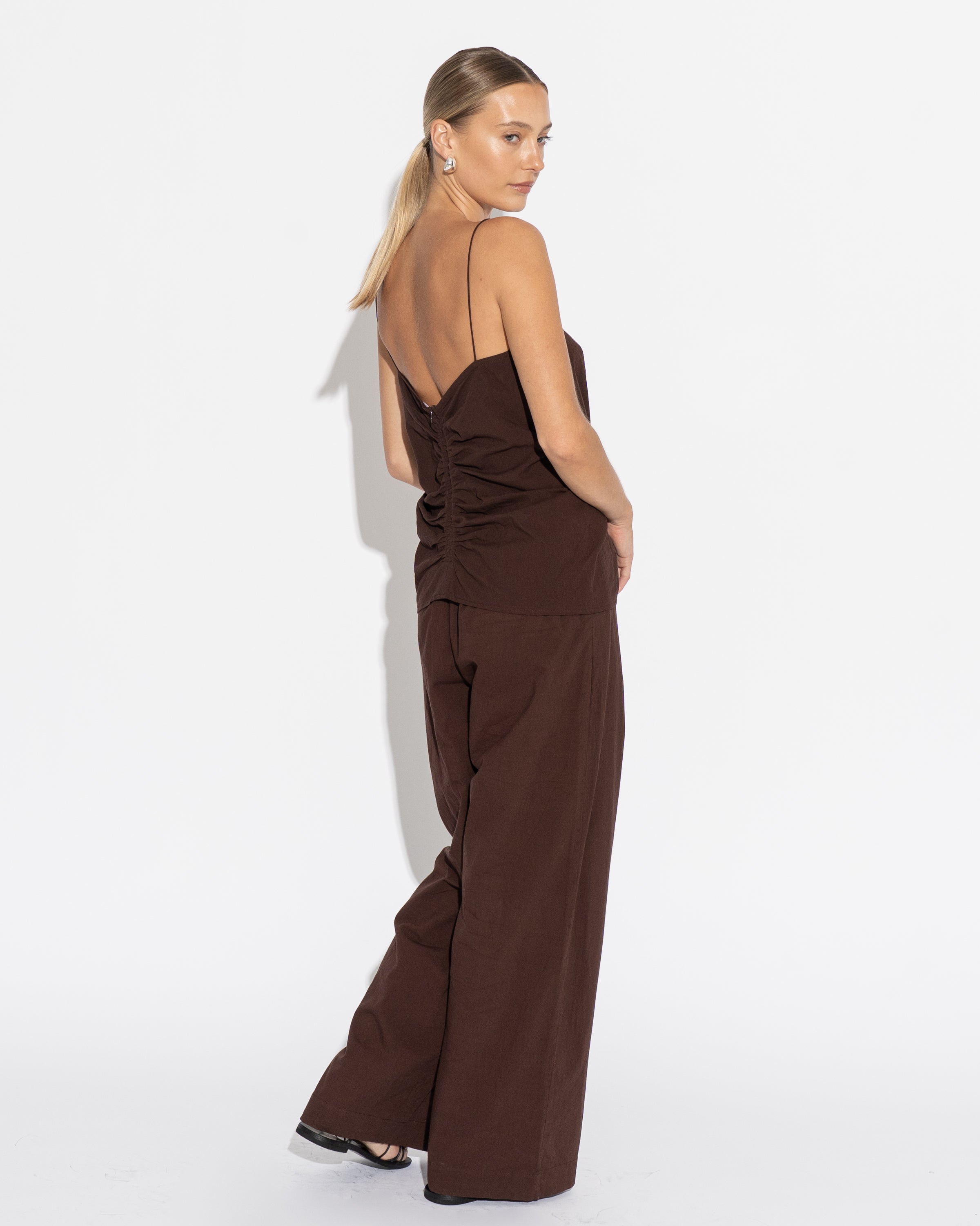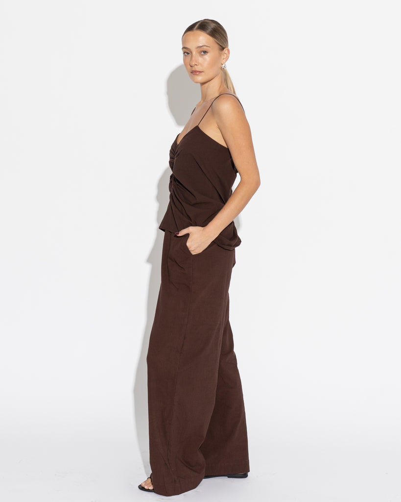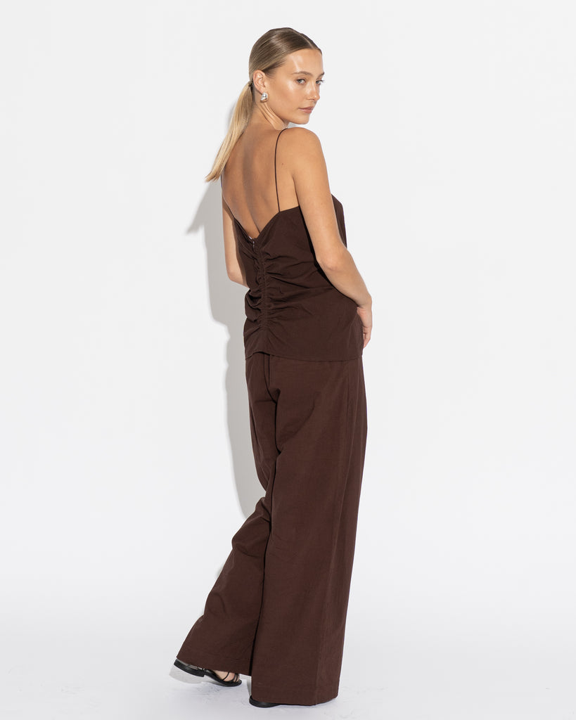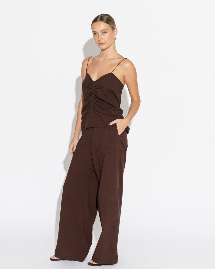 Full length, wide leg pant with slim flat fronted waist band, elasticised back and side pockets. Pair with our Caterina Top or Ruched Cami to complete the look.