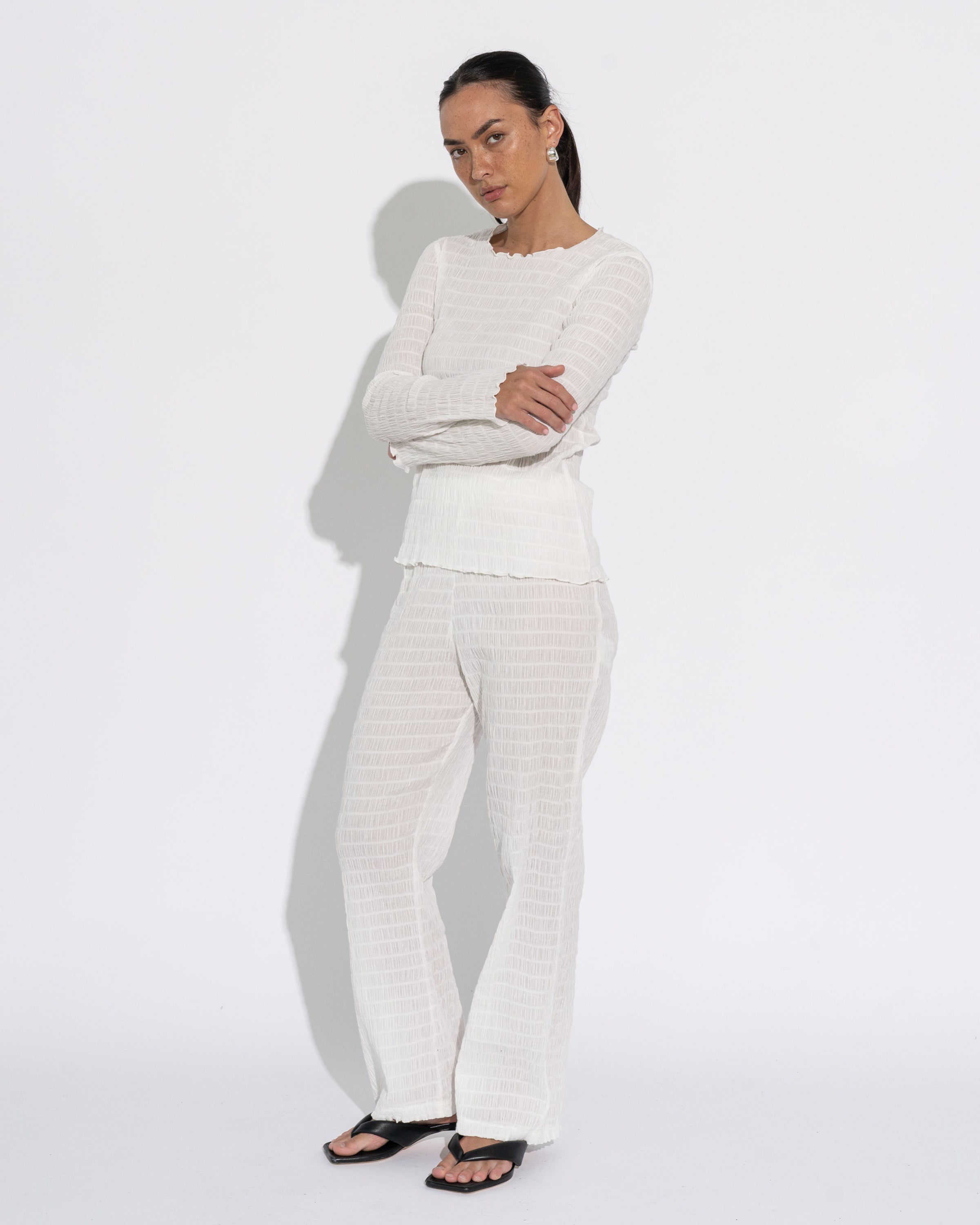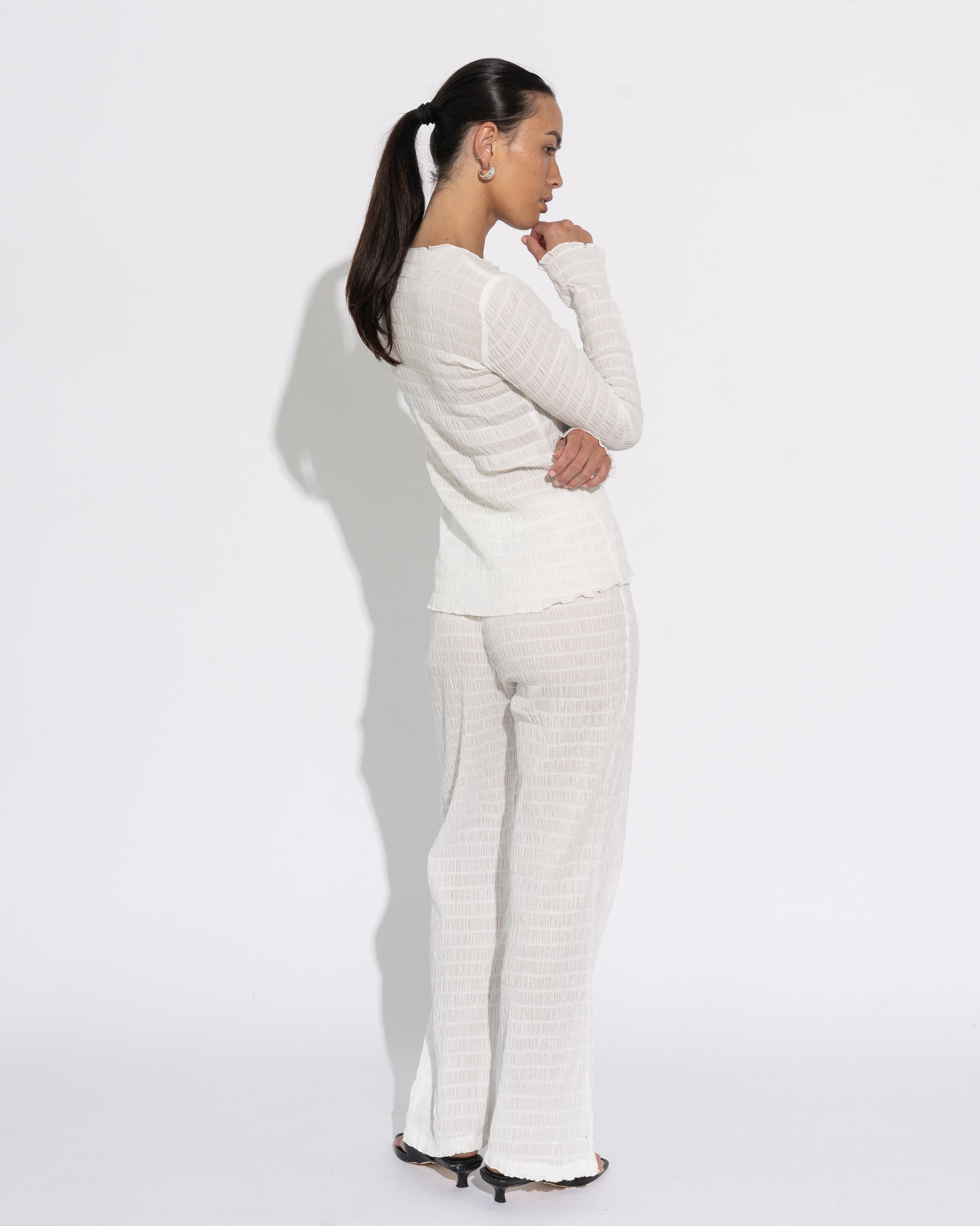 A slim line long sleeve top with a wide neckline finishing at the waist. Crafted in semi sheer puckered fabric. The perfect top for your Autumn/Winter capsule, worn on its own or layered. Styled with our Shiori Pant for a head-to-toe look.