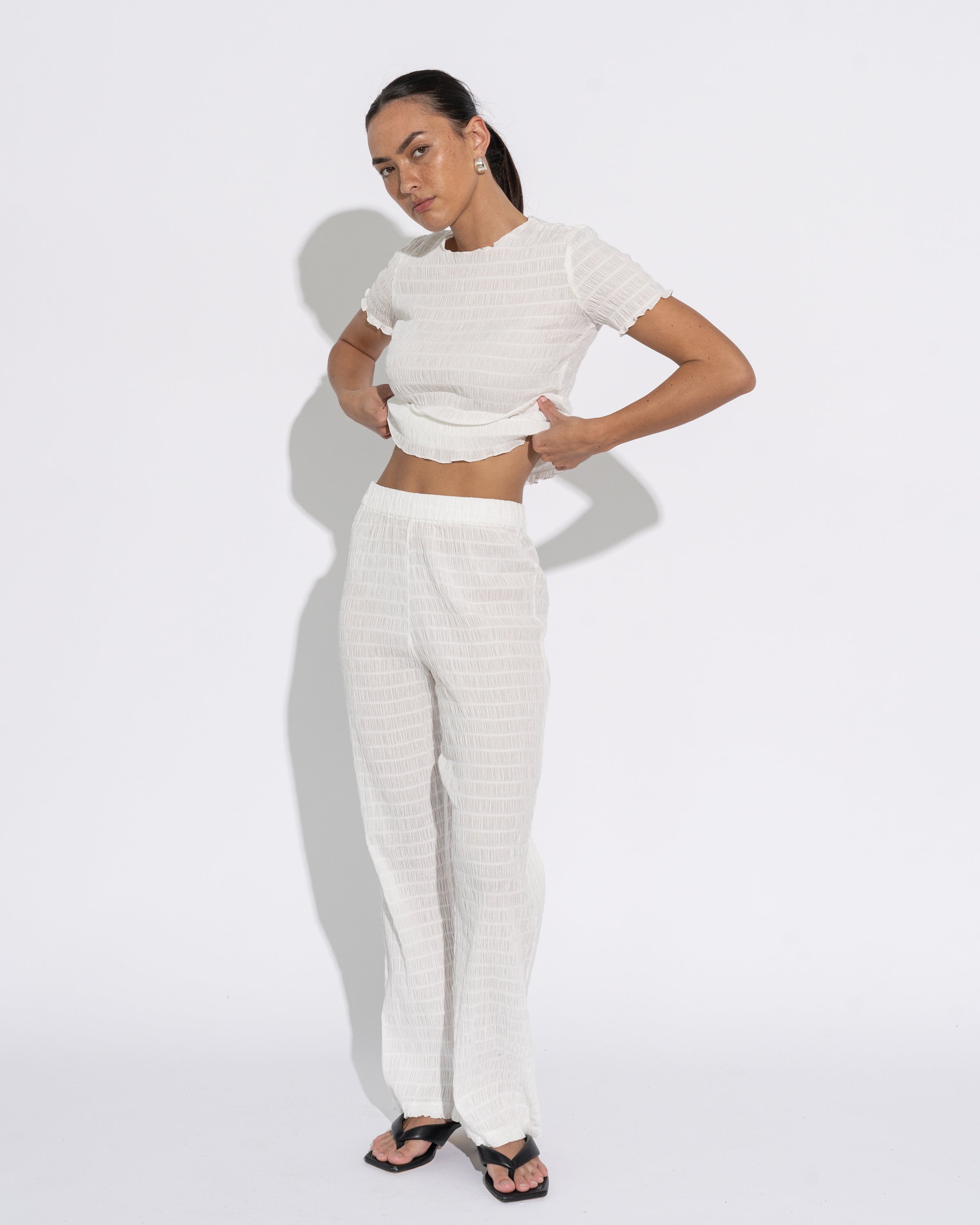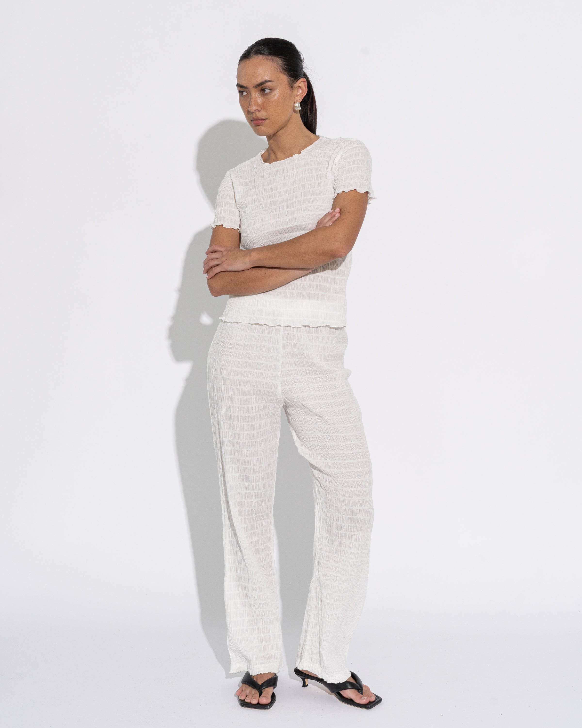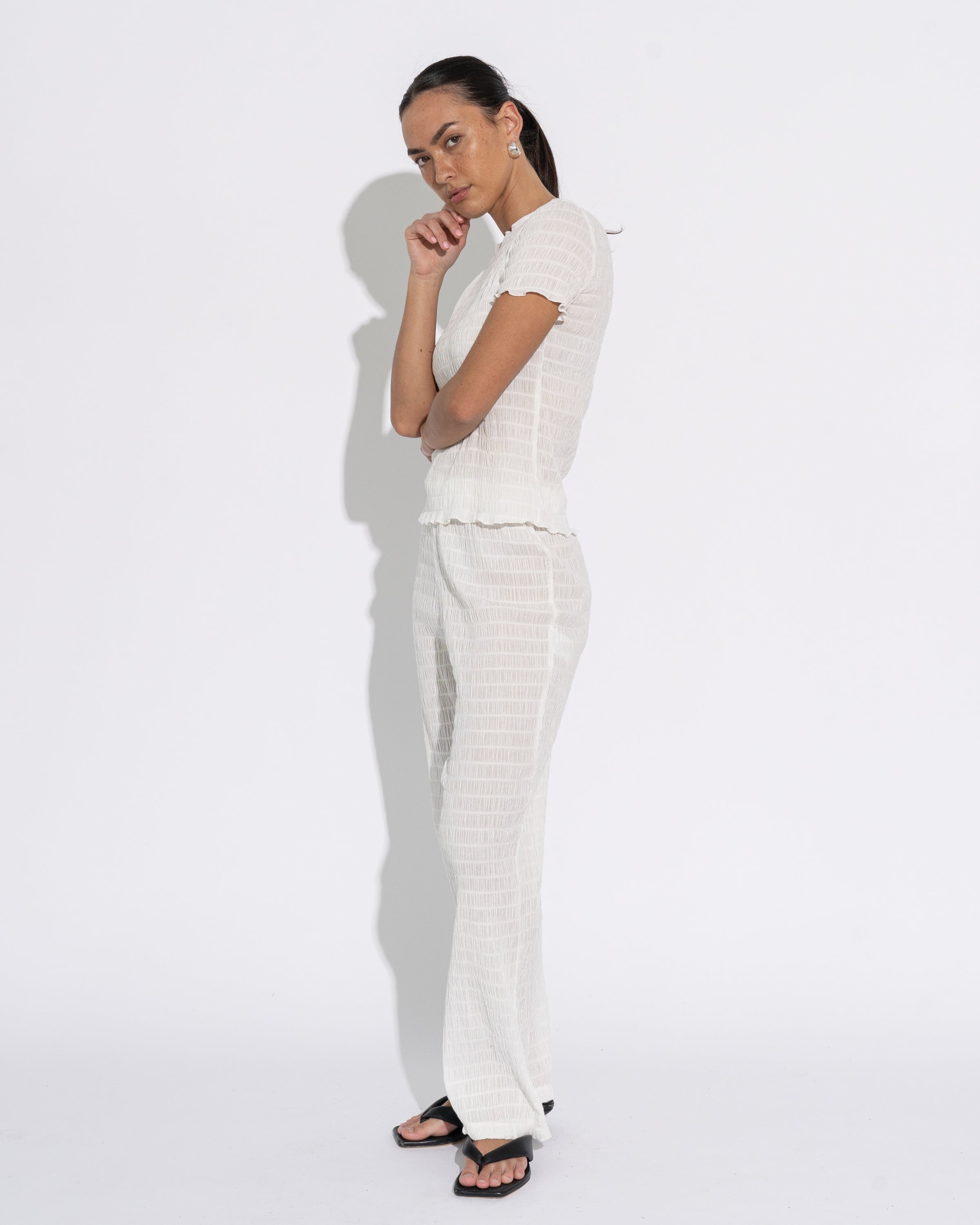 A slim line short sleeve top with a wide neckline finishing at the waist. Crafted in semi sheer puckered fabric in off white. The perfect top for your Autumn/Winter capsule, worn on its own or layered. Styled with our Shiori Pant for a head-to-toe look.